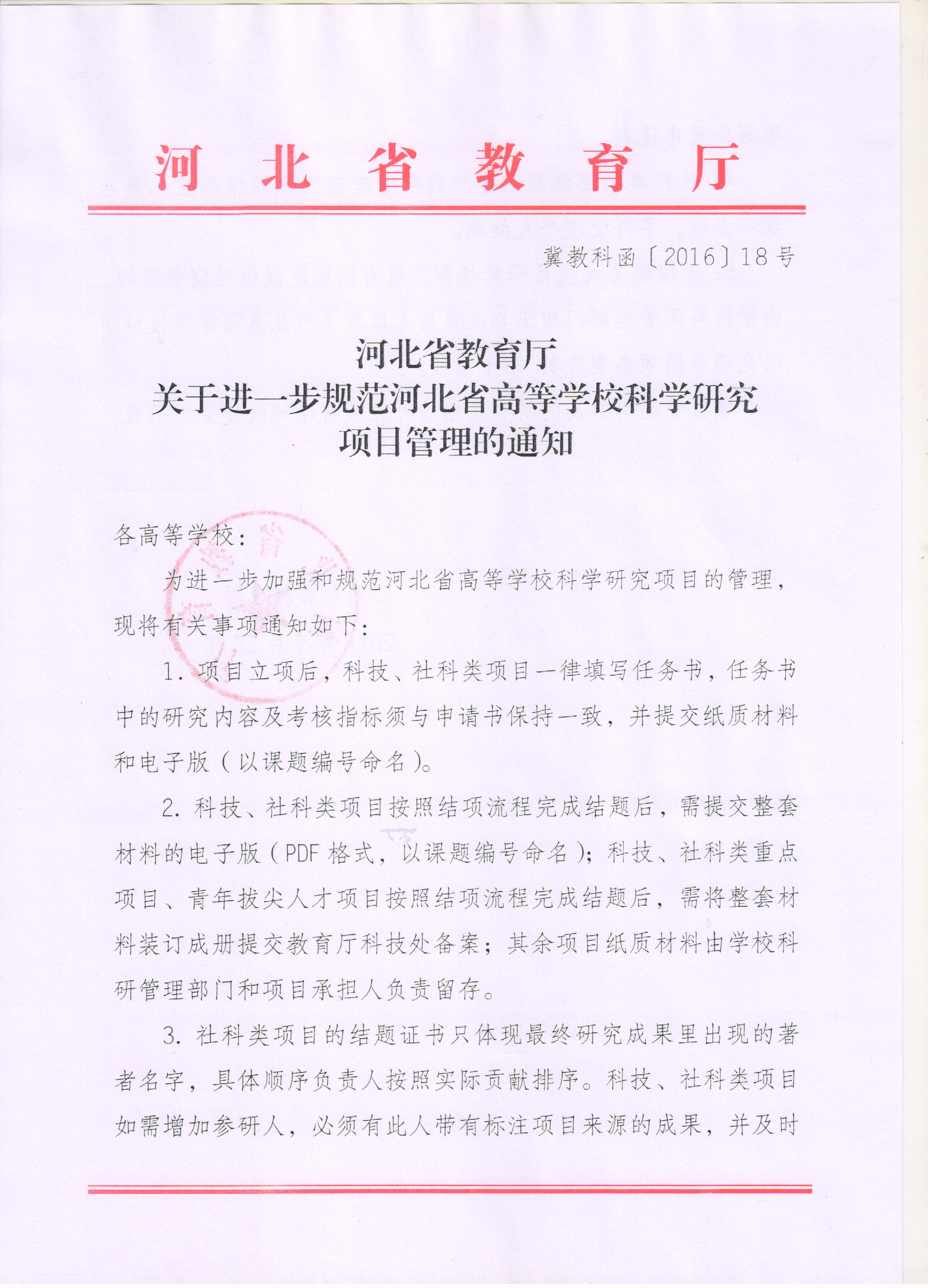 《河北省教育厅关于进一步规范河北省高等学校科学研究项目管理的通知》